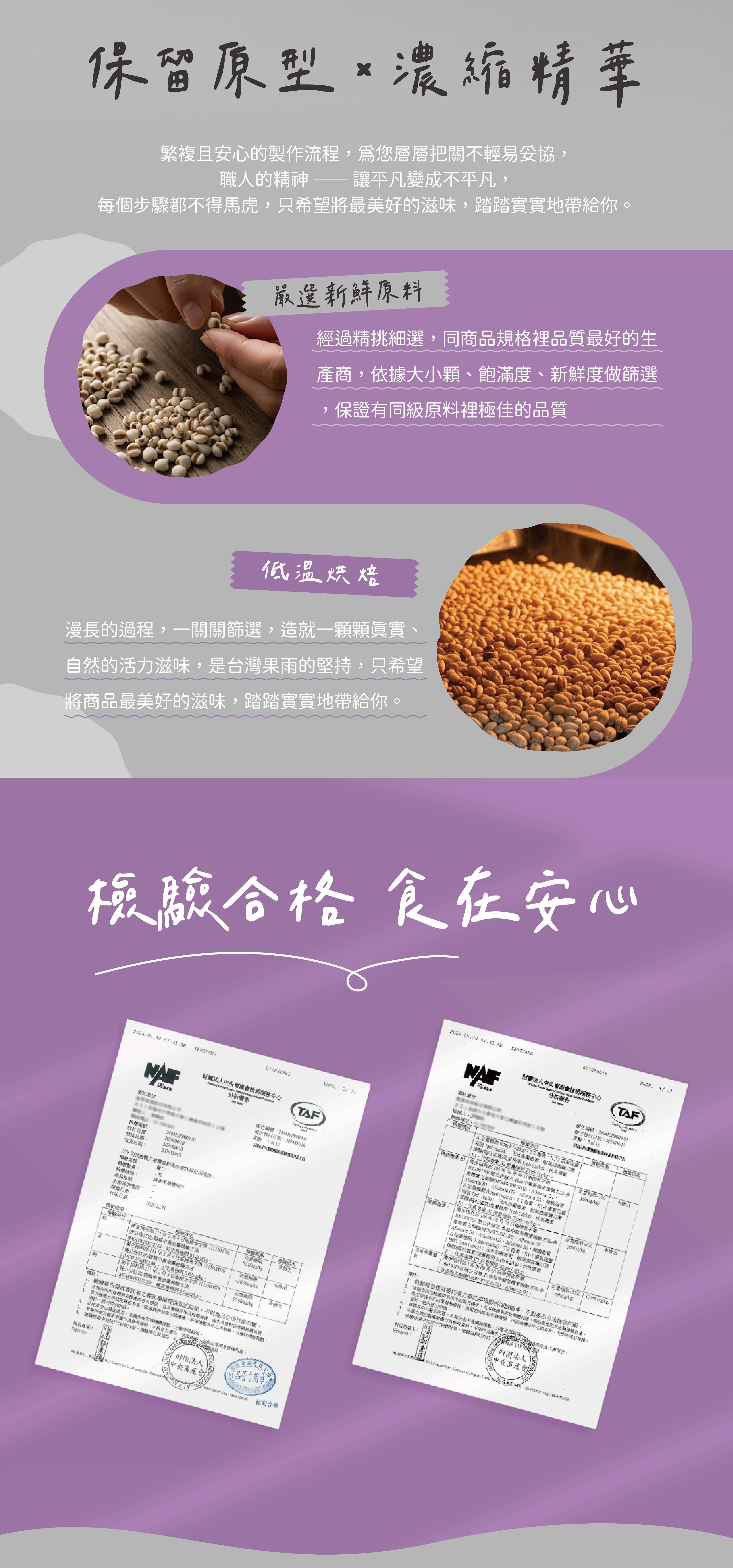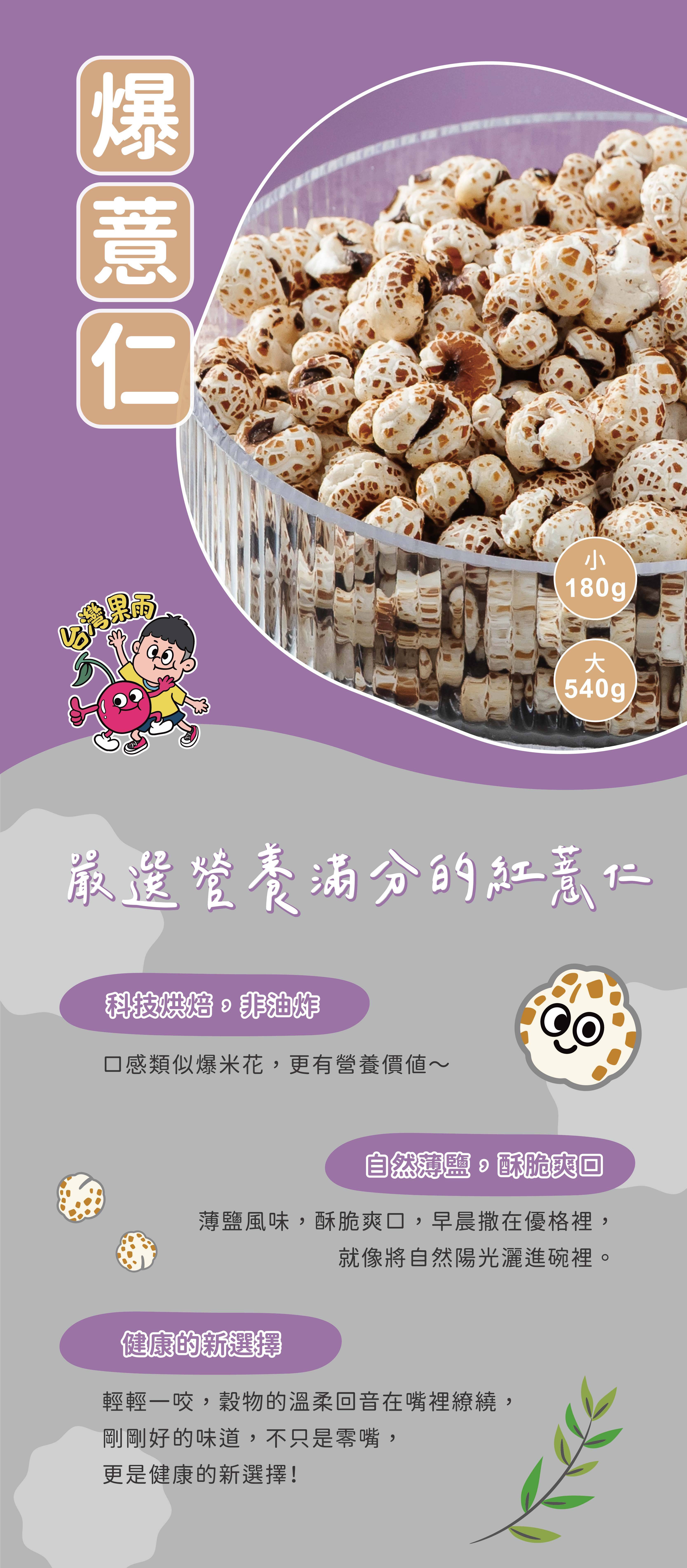 嚴選營養滿分的紅薏仁,控制含水量,以膨發高壓熟成技術烘焙製作,非油炸,